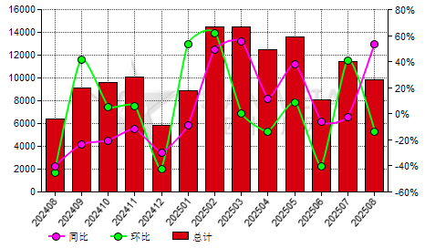 巴西2025年8月份热冷钢带进口量同比增加144.99%